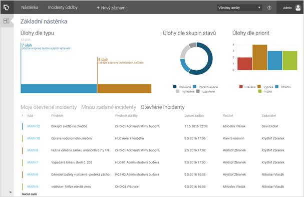 Ze seznamu incidentů údržby je možné přejít na detail incidentu (kliknutím na záznam v tabulce), na nástěnku (tlačítko Nástěnka v záhlaví stránky) nebo založit nový incident (tlačítko Nový záznam v záhlaví stránky).