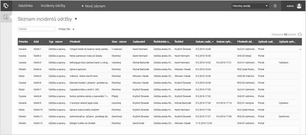 Seznam incidentů údržby obsahuje přehled všech incidentů údržby. Incidenty je možné vyhledávat pomocí fulltext vyhledávače, třídit a filtrovat.