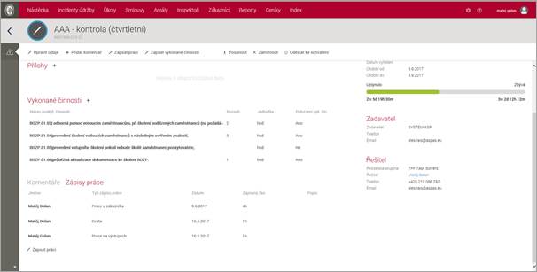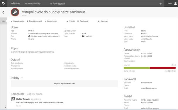 Stránka Detail incidentu obsahuje informace o vzniku a řešení incidentu, připojené přílohy, komentáře, zápisy práce.