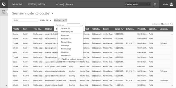 V seznamu incidentů údržby je možné vyhledávat záznamy na základě klíčového slova pomocí fultextového vyhledávače nebo filtrovat dle požadovaných kritérií pomocí dostupných filtrů. V systému GTServiceDesk jsou dostupné textové, intervalové a datumové filtry. Při práci s textovými filtry je možné definovat, zda má být zohledněna velikost písmen či nikoliv.