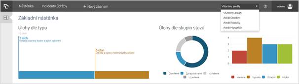 Má-li uživatel oprávnění k více entitám – např. areálům, může na stránce nástěnky a v seznamu incidentů údržby uživatelsky měnit výběr vstupních dat do grafů, přehledů a tabulek.