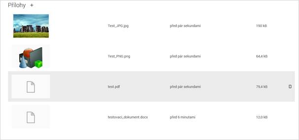 Na základě přístupového oprávnění přihlášeného uživatele, je možné přílohy mazat.