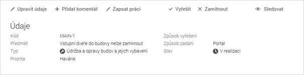Editační dialog incidentu údržby je vyvolán pomocí tlačítka Upravit údaje. Na základě stavu, ve kterém se incident nachází, dochází k uzamykání vybraných polí pro editaci.