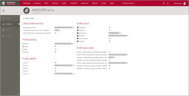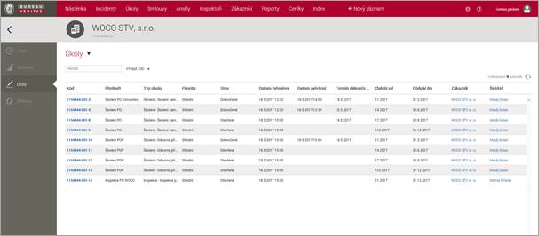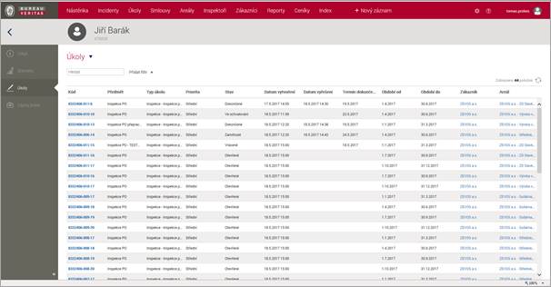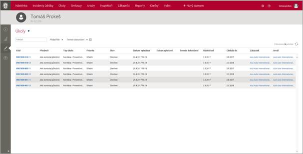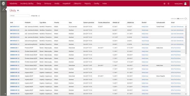 Každý přehled obsahuje seznam kategorií vyplývající z daného pohledu a ke každé kategorii informaci o počtu úkolů i ve formě grafu či % vyjádření podílu na všech úkolech daného inspektora. Na každou kategorii je možné se prokliknout a jste přesměrováni na seznam vybraných úkolů z daného přehledu a kategorie. Ze seznamu se následně dá prokliknout na detail úkolu přes Kód úkolu nebo je možné se prokliknout na Zákazníka či Areál.