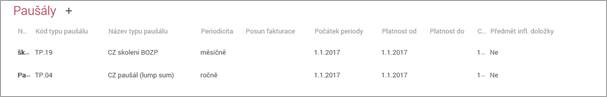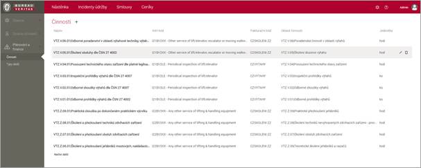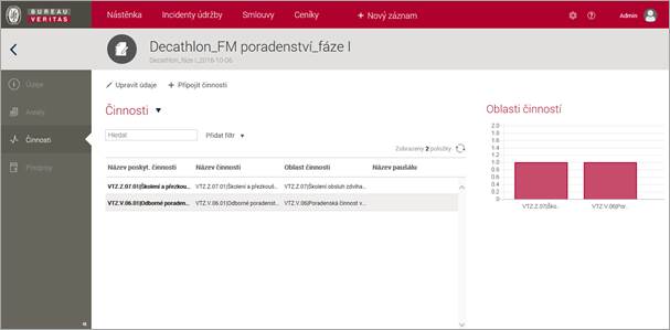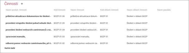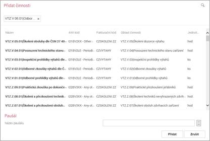 Okno činnosti obsahuje přehled definovaných činností, které je možné připojit ke smlouvě.