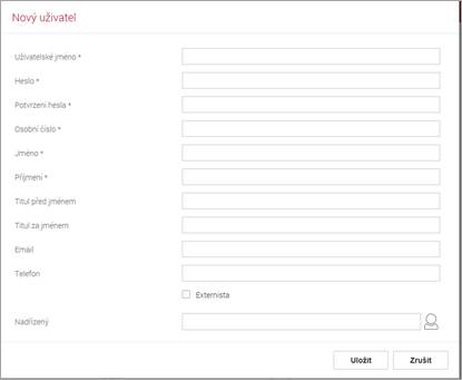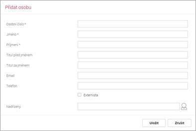 číslo, jméno, příjmení, titul, email, telefon). Dále je možné vyplnit zda-li je osoba externí/interní a