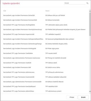 Dále můžete přidávat systémová oprávnění, která budou definovat uživatelskou roli. Systémová oprávnění jsou rozdělena pro evidence ServiceDesk (SD) a Tasks&Planning&Finance (TPF) a oprávnění začíná zkratkou příslušné evidence. Základním oprávněním pro přístup do příslušných evidencí jsou tyto: