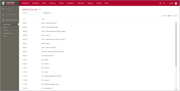 Okno s evidencí oblasti činností zobrazíte klepnutím na