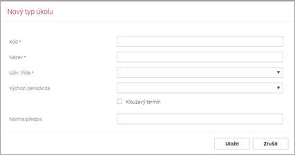 založení nového typu úkolu, kde vyplníte Kód, Název, vyberete z nabízených